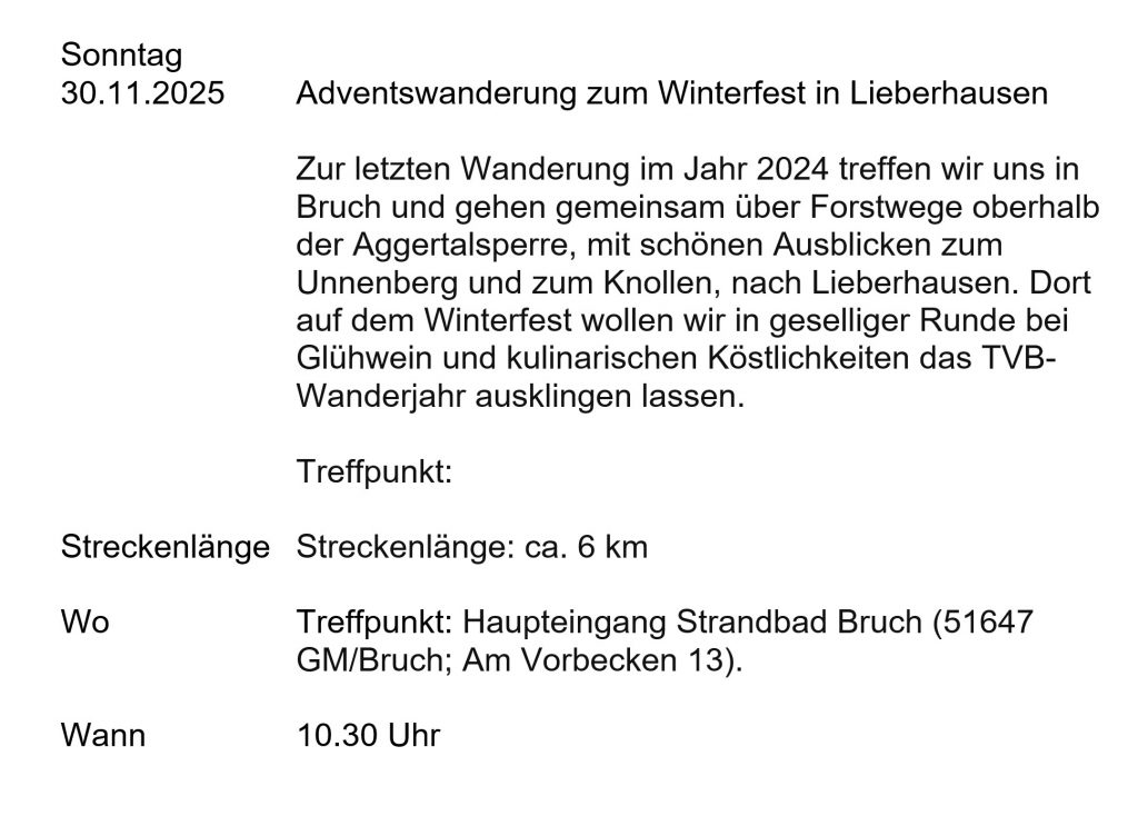 Am Sonntag, den 28.09.2025 fand die vierte Wanderung 2025 des TVB bei bestem Wanderwetter statt. Sie führte uns nach Hoffnungsthal. Der Start lag am Bahnhof Hoffnungstal und ging weiter an der Sülz vorbei bergauf zu den Spuren des Bergbaus der Region. Auf dem Rückweg kamen wir am Tunnelausgang der Bahn vorbei und weiter bergab nach Hoffnungsthal zur Einkehrstation. Hier haben wir den Tag gemütlich ausklingen lassen.